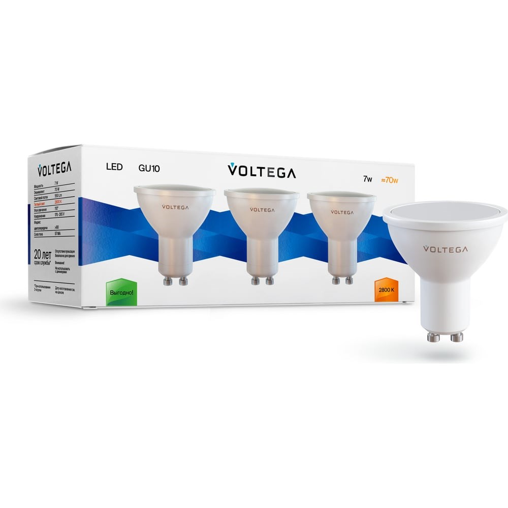Светодиодная лампа VOLTEGA Софит GU10 2800K 7W угол/рассеивания 110 Комплект 3шт 7172 может использоваться с натяжными потолками и в местах, где возможно прикосновение рукой. Дает ровный свет без мерцания и пульсации.