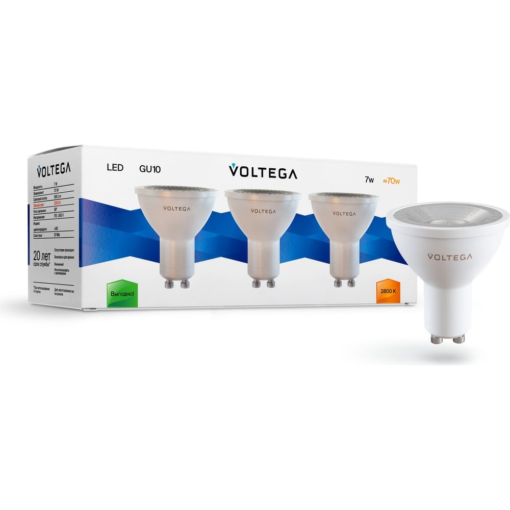 Светодиодная лампа VOLTEGA Софит GU10 2800K 7W угол/рассеивания 38 Комплект 3 шт 7176 может использоваться с натяжными потолками и в местах, где возможно прикосновение рукой. Дает ровный свет без мерцания и пульсации.