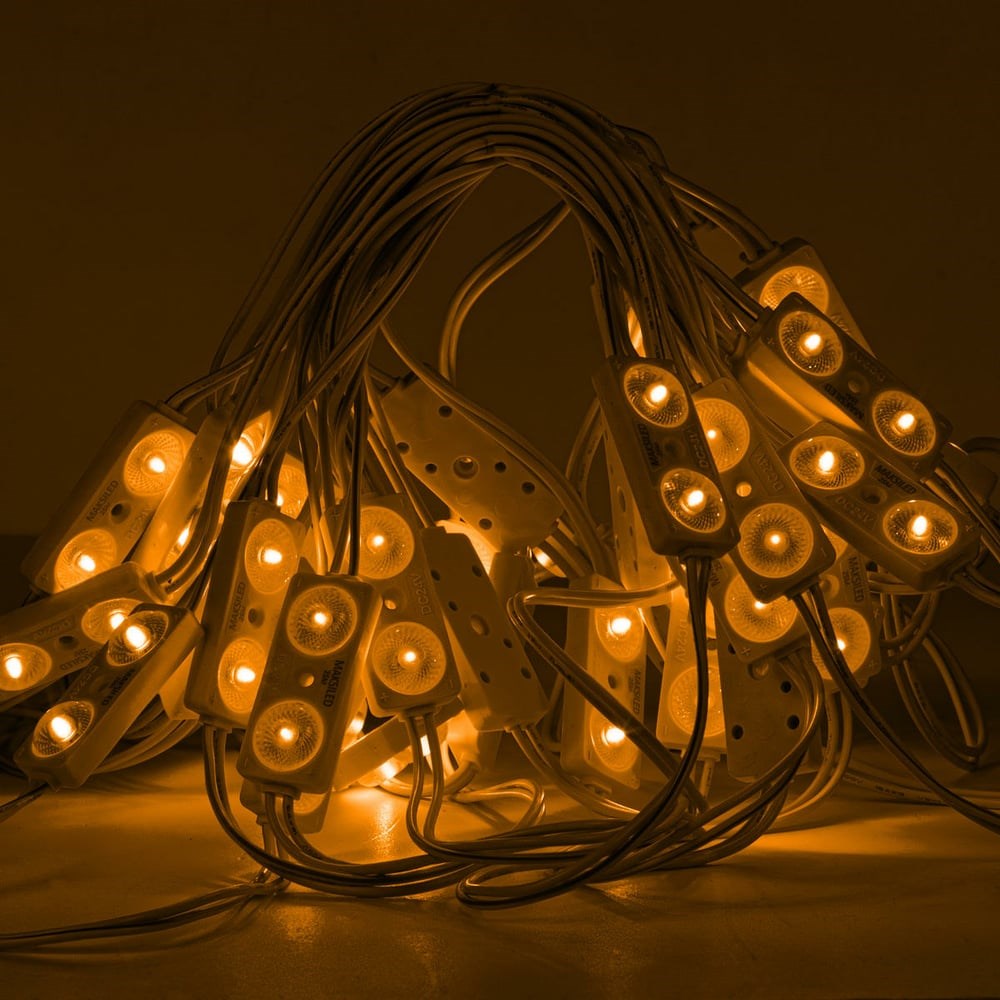Светодиодный модуль MAKSILED 0.96вт, 24в, ip67, smd2835 2led, 25лм, желтый, 40 шт./упаковка ML-M2SM-L-2835-Y-24V предназначен для внутреннего и наружного освещения, рекламных вывесок, световых коробов, объемных букв. Продается гирляндами по 40 штук, соединены между собой и могут отрезаться в нужном количестве. Потребляемый ток 40±2mA. Длина провода между модулями 200 мм, рекомендуемая глубина установки 70-100 мм. Светодиодный модуль имеет удобный крепежный элемент - двусторонний скотч + "отверстие" для жесткой фиксации. Светодиодные модули рассчитаны на постоянное напряжение 24 B, поэтому при подключении к сети 220 В потребуется соответствующий блок питания на 24 В 60 Вт из расчета на 40 модулей (с учетом запаса мощности). Электромонтаж достаточно прост и производится методом пайки, либо при помощи коннекторов и клеммных колодок (в комплект не входят).