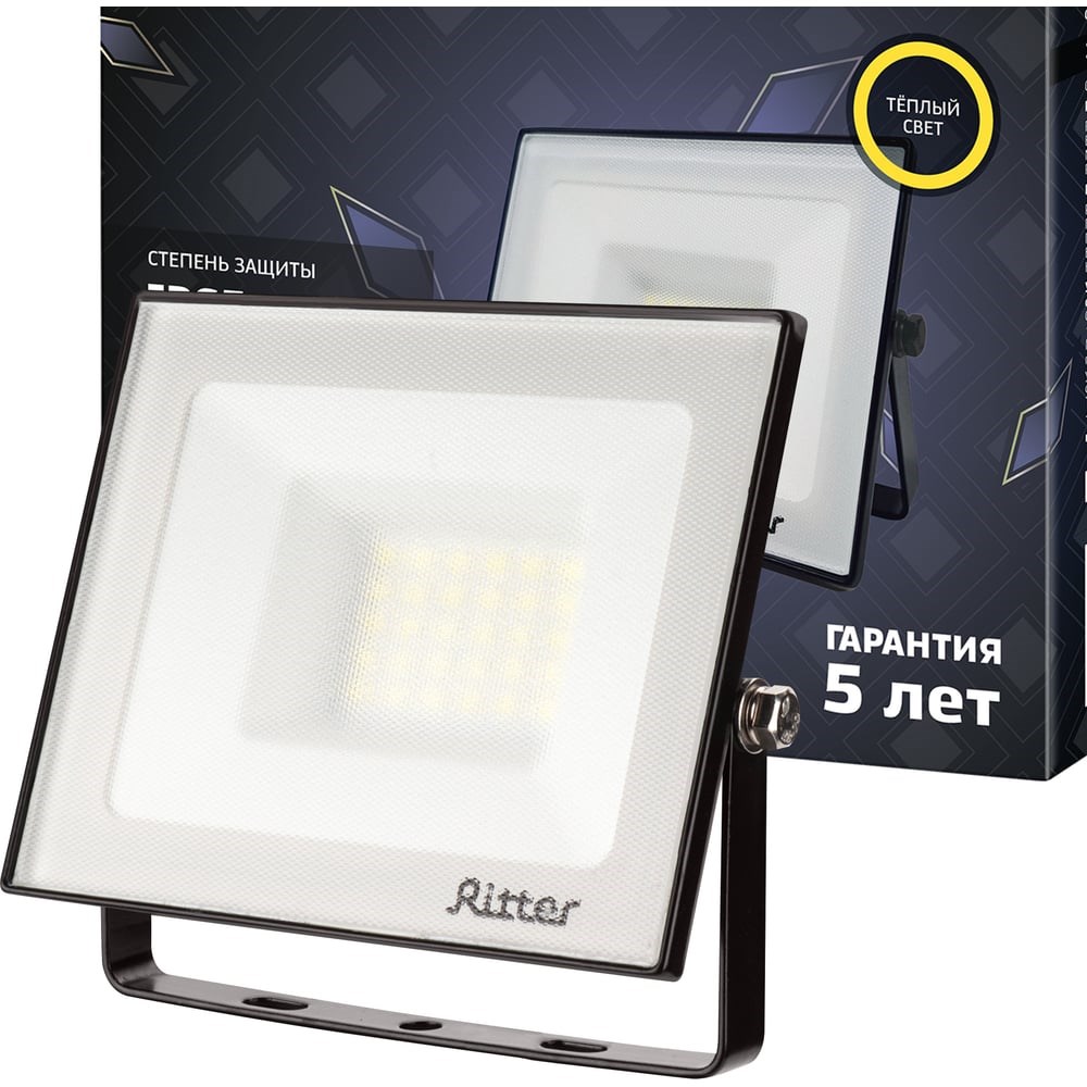 Светодиодный прожектор RITTER Profi гарантия 5 лет 100лм/Вт 30 Вт 2700К 53427 7I предназначен для общего и акцентного освещения больших открытых территорий, домов, зданий, сооружений и промышленных объектов. Прочный алюминиевый корпус и закаленное стекло защищают прожектор от неблагоприятных погодных условий и при этом обладают высокими теплопроводными характеристиками. Прожекторы серии PROFI не теряют своей эффективности при снижении напряжения в сети до 180 В, а использование новейших светодиодных технологий позволяет получить мощный светодиодный поток при низком потреблении электроэнергии. Площадь освещения: 25м2. Угол рассеивания: 120 градусов. Температура эксплуатации: от -40С до +45С. Сечение провода: 3х0,75 мм2. Материал рассеивателя: закаленное матовое стекло. Гарантия: 5 лет.