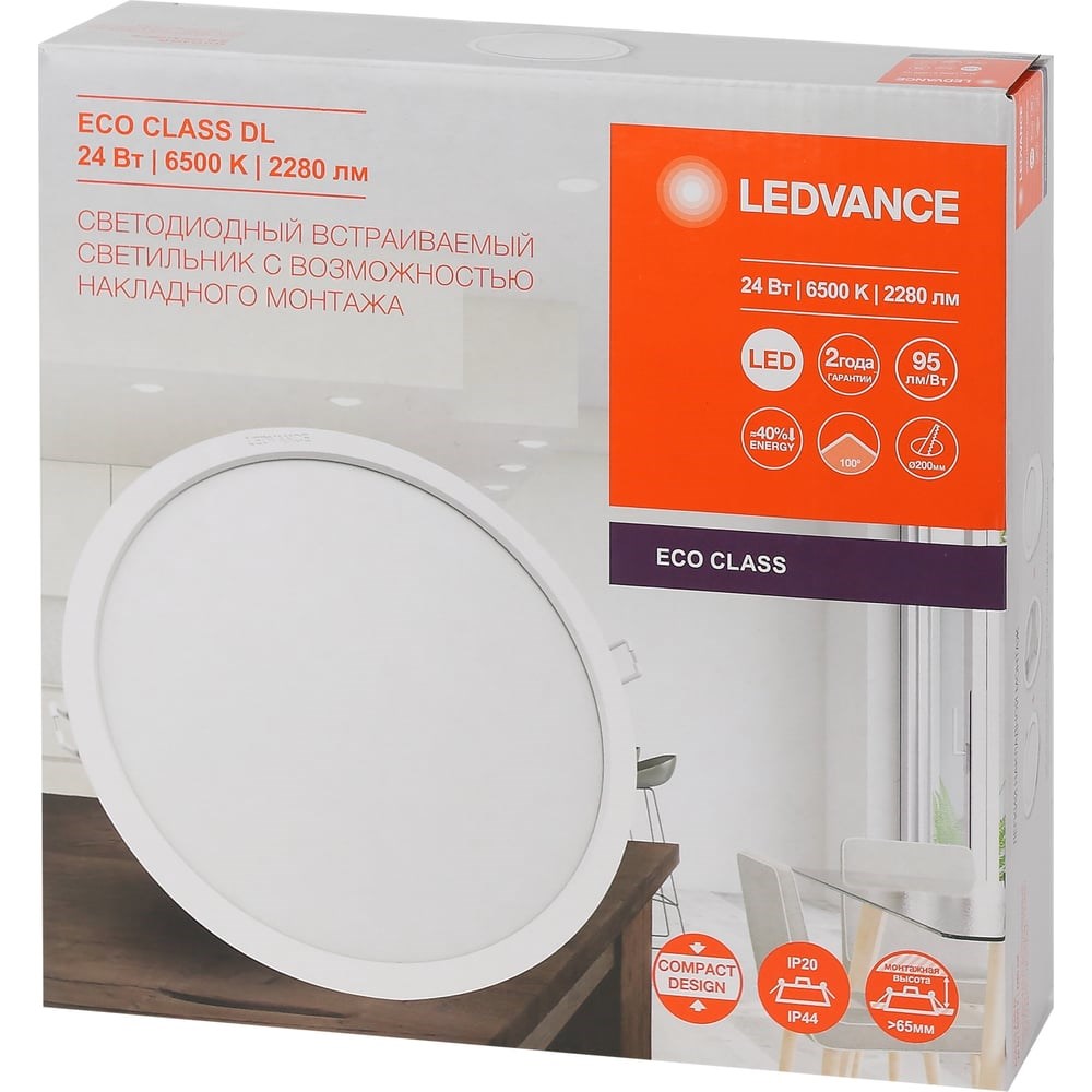 Компактные встраиваемые светильники-даунлайты LEDVANCE ECO CLASS. Идеальны для любых потолков. Благодаря встроенному драйверу доступен легкий и удобный монтаж и подключение. Повышенная светоотдача 95 лм/Вт - яркий и экономит электроэнергию Равномерный свет без бликов Низкий коэффициент пульсации Не искажает цвета благодаря CRI>80 IP44 по внешней части - подходит для влажных помещений Доступен накладной монтаж с помощью специальной рамки