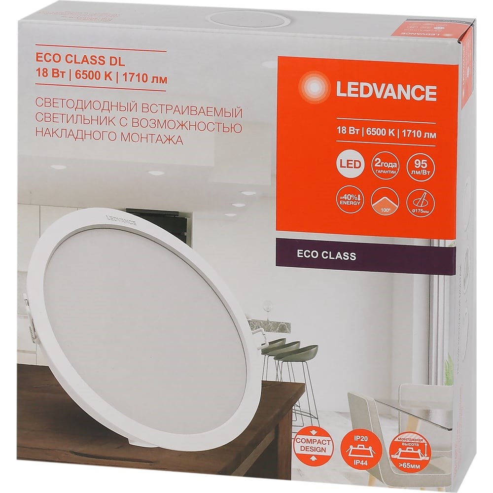 Компактные встраиваемые светильники-даунлайты LEDVANCE ECO CLASS. Идеальны для любых потолков. Благодаря встроенному драйверу доступен легкий и удобный монтаж и подключение. Повышенная светоотдача 95 лм/Вт - яркий и экономит электроэнергию Равномерный свет без бликов Низкий коэффициент пульсации Не искажает цвета благодаря CRI>80 IP44 по внешней части - подходит для влажных помещений Доступен накладной монтаж с помощью специальной рамки