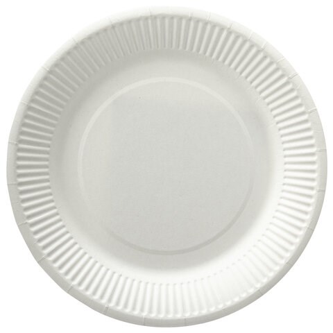 Тарелка одноразовая бумажная 230 мм, КОМПЛЕКТ 100 шт., БЮДЖЕТ, белая мелованная, LAIMA, 608084