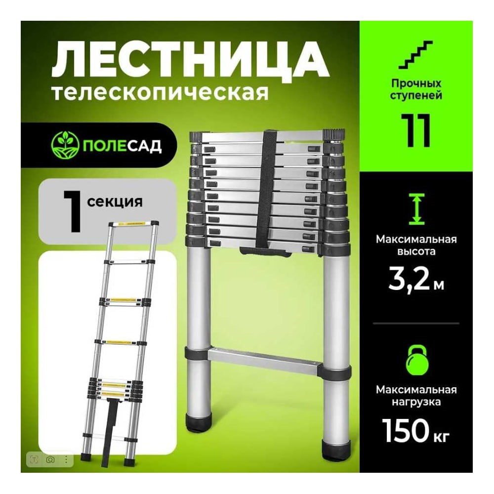 Телескопическая раскладная лестница "ПОЛЕСАД" 3,2 м Телескопическая раскладная лестница - идеальное решение для строительных, садовых, домашних и ремонтных работ, для использования в гараже, на складе и дачных участках. Представляет собой мобильную многофункциональную конструкцию, состоящую из отдельных секций, которые соединяются между собой посредством шарниров и фиксаторов. Раздвижная лестница изготовлена из прочного алюминиевого профиля, который гарантирует надежность и долговечность. Данный строительный инструмент имеет удобные прочные ступеньки, разработанные специально для обеспечения безопасности и комфорта пользователя. Максимальная высота 3,2 метров, максимальная нагрузка 150 кг. Изделие легкое и компактное, что обеспечивает удобство транспортировки и хранения. Складная лестница незаменима для любых задач, связанных с работой на высоте.