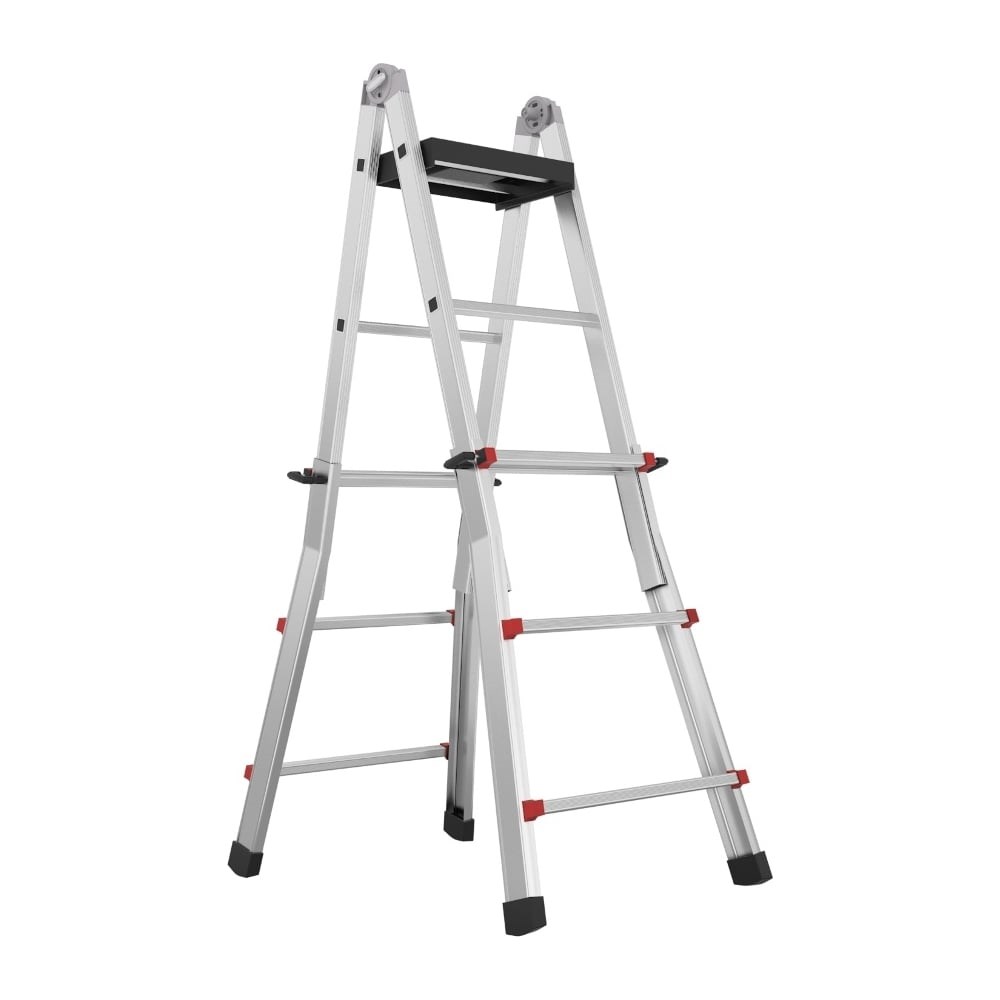 Лестница-стремянка телескопическая из экструдированного алюминия с ребрами жесткости, с телескопическим удлинением и расширенным основанием. Создана для профессионального использования и хобби, можно использовать как приставную, стремянку или устанавливать на лестничных пролетах. Расстояние между ступенями 28 см. Противоскользящие башмаки из ПВХ. Внутренний вертикальный профиль 57x27 мм. Внешний вертикальный профиль 64x30 мм. Внутренняя ширина подъема 36,5 см. Полипропиленовая полка для инструментов 31x36 см. Стальные предохранительные крючки с нейлоновым покрытием. Упаковка: термоусадочная пленка с этикеткой. Алюминиевые петли с 3 положениями быстрого позиционирования: открывать и закрывать лестницу в положении «стремянки» без использования петель. зафиксировать открытую лестницу в положении «стремянки», при помощи петель. открыть лестницу в положении «приставная», при помощи петель.