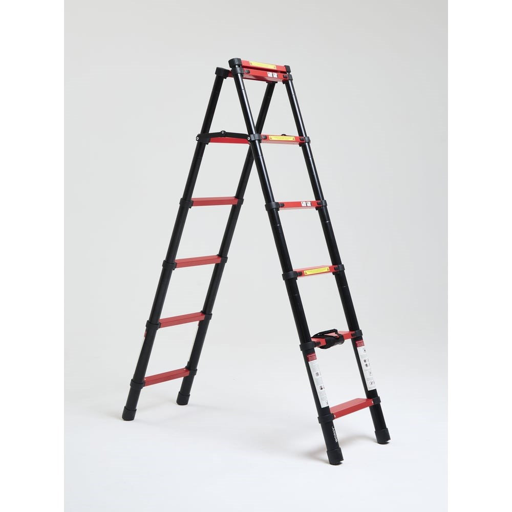 Телескопическая лестница-стремянка WORKY BLACK 6+7 ступеней, 1.7м+2м ARD257796 входит в премиум сегмент лестниц благодаря повышенной надёжности и качественному крашенному покрытию, которое бережёт лестницу от износа, не оставляет алюминиевого следа на руках и придаёт современный стильный вид вашей лестнице. Противоскользящие опорные башмаки из резинопластика, которые защищают напольные покрытия, обеспечивают крепкое сцепление с любой поверхностью. Она легко транспортируется, так как без проблем помещается даже в небольшой автомобиль. Лестница без усилий раскладывается и мало весит. Имеет рифленые ступени, которые гарантируют надёжное сцепление стопы с поверхностью. Ступеньки в рабочем положении фиксируются автоматически. Система блокировки предохраняет от непроизвольного складывания лестницы, разблокировка осуществляется нажатием кнопок на ступенях.