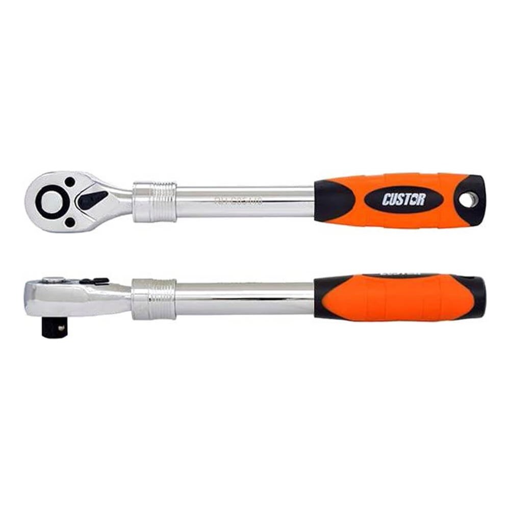 Трещоточный ключ CUSTOR 3/8" телескопический RH-D85348 имеет 72 зуба. Приводной квадрат: 3/8″ Максимальный момент 202 Нм Длина 305-445 мм