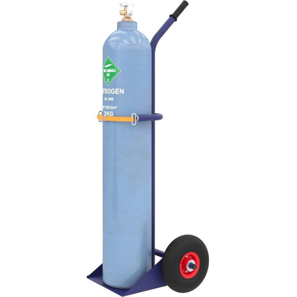Тележка для баллона с фиксацией ремнем RUSKLAD ГБР 1 d250мм ГБР 1 пневмо Ремень служит для перевозки одного баллона (кислородного, ацетиленового или углекислотного). Изделие выполнено из прочных материалов, каркас представляет собой трубы диаметром 30 мм. Баллон крепится к каркасу ремнём. Благодаря полимерному порошковому покрытию тележка устойчива к влиянию коррозии, что позволяет использовать приспособление на открытом воздухе даже при неблагоприятных погодных условиях. Данная тележка оснащена пневматическими колёсами d250 мм.