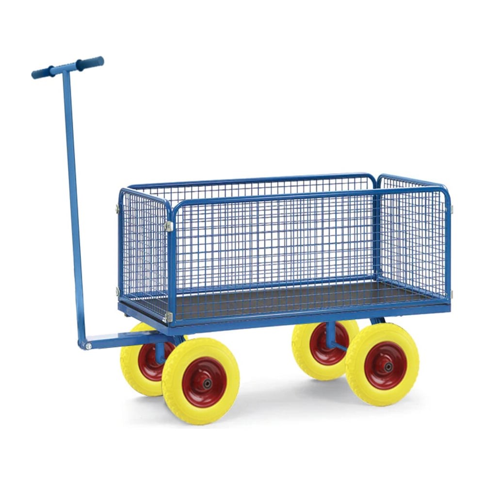 Тележка с ручным управл. поворот. осью и сетчатыми бортами 900x1600 ТРУС-16090 легка и проста в применении. Идеально подходит для перевозки груза в коробках, ящиках, евробоксов на складах, в торговых залах, на производстве. Предназначена для регулярного, интенсивного использования.Опорная рама: СтальНастил: стальной лист 2 ммОграждающий сетчатый бортик: 320 ммПередняя ось поворотная, задняя ось фиксированнаяВысота ручки: 770 ммУстойчивое к царапинам порошково-полимерное покрытие синего цвета RAL 5012Грузоподъемность: до 600 кг
