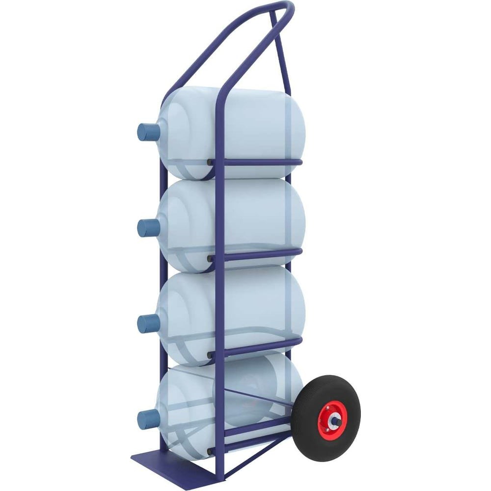 Тележка с пневматическими колёсами RUSKLAD ВД 4 пневмо предназначена для перевозки до четырех 19 литровых бутылей с водой. Каркас изготовлен из труб диаметром 25 мм. Ложементы также сделаны из труб, они позволяют без труда размещать в них бутылки. Тележка обладает двумя пневматическими колесами диаметром 250 мм. Полимерное порошковое покрытие устойчиво к влиянию коррозии, что дает возможность использовать тележку на открытом воздухе даже при неблагоприятных погодных условиях
