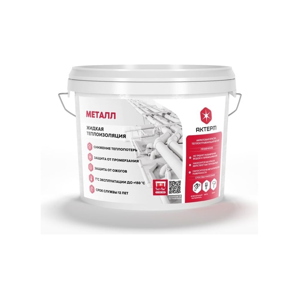 Жидкая теплоизоляция АКТЕРМ Металл 10 л 10027 предназначено для термоизоляции металлических конструкций, таких как горячие трубопроводы, котлы, печи, а также для теплоизоляции цистерн, емкостей, ангаров, хладокомбинатов, хранилищ и автотранспорта. Продукт обеспечивает защиту от промерзания. Легко наносится кистью, валиком или аппаратом безвоздушного нанесения.