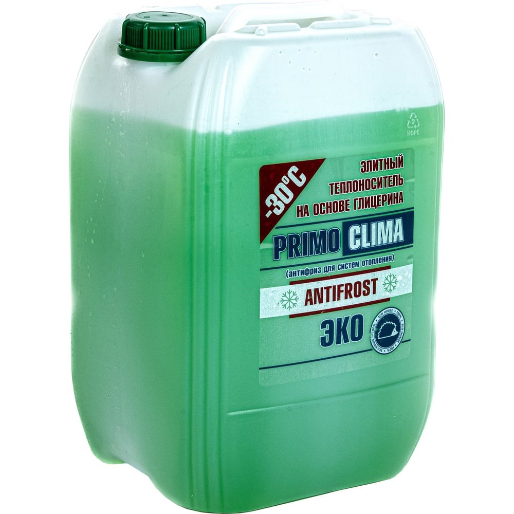 Теплоноситель Глицерин -30C ECO 20 кг, канистра, цвет зеленый Primoclima Antifrost PA-30C ECO 20 подходит для использования в системах отопления закрытого и открытого типа, системах вентиляции и кондиционирования. Изготовлен на основе глицерина, содержит пакет специальных антикоррозионных присадок. Глицерин безопасен для здоровья людей и животных, не выделяет ядовитых веществ.  Теплоноситель позволяет работать оборудованию в пределах от – 30оС до 106оС. Не входит в реакцию с уплотнительными материалами, что исключает вероятность протечек. На объем системы 100 л необходимо 115 кг теплоносителя. Состав готов к использованию.  Срок хранения 4 года с даты изготовления.