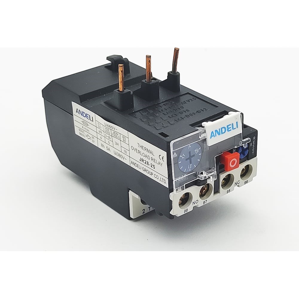 Тепловое защитное релеANDELIJR28 предназначено для защиты электродвигателей от перегрузок, затянутого пуска, заклинивания ротора и обрыва фазы.СерияANDELIJR28 применяется в сетях с переменным током 50 или 60 Гц, напряжении до 660В, и силой тока до 93А.Реле серии JR28 также применяются в качестве комплектующих изделий в схемах управления электропроводами совместно с контакторами серии CJX2 (LC1-):СерияJR28 представлена в 3-х типоразмерах:JR28-25 для контакторовCJX2-09,CJX2-12,CJX2-18,CJX2-25,CJX2-32JR28-36для контакторовCJX2-32JR28-93для контакторовCJX2-40,CJX2-50,CJX2-65,CJX2-80,CJX2-95Номинальное напряжение: 690 В, 50 Гц Номинальный токIn, A: 0,1А - 93A