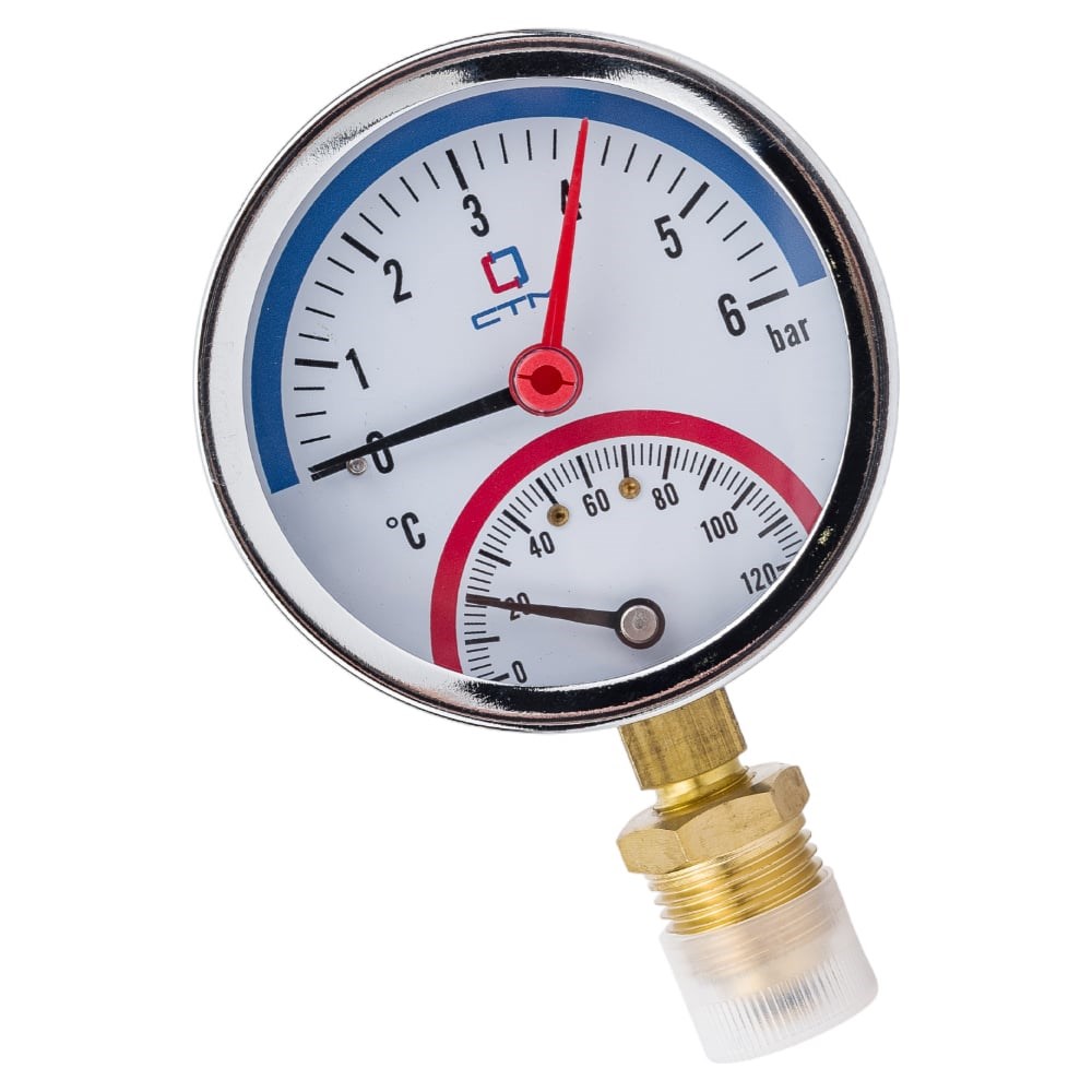 Термо-манометр СТМ радиального подключения 1/4", измерение до 6 бар, до +120° С предназначен для индикации температуры и давления на бытовых системах отопления и водоснабжения. Термо-манометр поставляется с накрученным переходником-клапаном 1/2”, позволяющим демонтировать термо-манометр без разгерметизации системы. Материал корпуса – металл, стекло Материал чувствительного элемента – медь Класс точности – 2,5 Диапазон температуры окружающей среды-10 +60° С Диапазон температуры рабочей среды 1 – 90° С