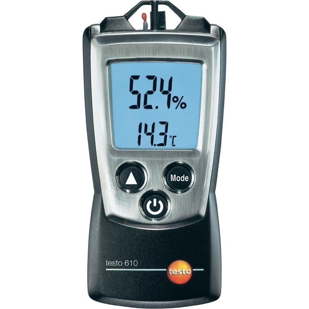 Термогигрометр Testo 610 оснащен встроенными функциями: удержание на экране полученного результата, определение максимального и минимального значения, которые упрощают работу оператора. Применяют данную модель для определения температуры и влажности воздуха. Высокая точность и достоверность измерений обеспечивается за счёт термосенсора типа NTS и наружного датчика влажности. Благодаря влагозащищённому корпусу, соответствующему классу IP20, прибор можно использовать в стационарных и полевых условиях. Пластиковая крышка обеспечивает защиту сенсоров термочувствительного элемента и кнопок управления в нерабочем режиме. Прибор отличается низкой массой, простотой управления и низким уровнем энергопотребления. Срок автономной работы от двух элементов питания типа ААА составляет свыше 200 ч.