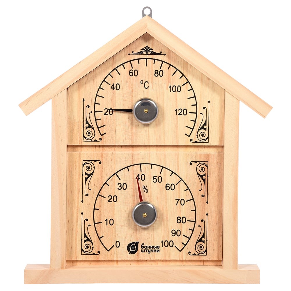 Термометр с гигрометром Банные штучки Банная станция домик, 23.6х22х2.5 см 18023помогает контролировать температуру в бане и сауне. Контролировать температуру и влажность воздуха в бане и сауне позволят специальные термометры и гигрометры. Каждая модель надежна, сделана из натурального материала - безопасного для здоровья человека, имеет креативное решение, которое добавит индивидуальности именно вашей бане. Русский человек любит ходить в баню, а особенно - париться. Однако полезно иметь измеритель, который позволяет следить за температурой и влажностью воздуха в парилке.