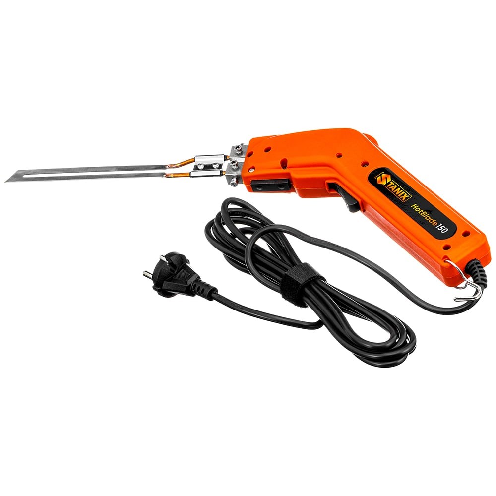 Термонож STANIX HOTBLADE 150 – электронож для беспыльной резки деталей и заготовок из полимеров – полистирола (EPS), поливинилхлорида (ПВХ), стиродура, полипропилена (ПП), полиэтилена (ПЭ) и других пластиков с низкой температурой плавления. Он подходит для моделирования, строжки и обрезки теплоизоляционных плит и широко используется в строительных компаниях, занимающихся внутренней и наружной отделкой зданий и сооружений, а также курьерских службах, где полистирол используется для защиты грузов. Кроме того, инструмент незаменим при раскрое брезента, кожи, термостойких тканей, рекламных баннеров, монтаже инженерных коммуникаций.Электрический ток нагревает ее до нужной температуры, что позволяет плавить и разрезать обрабатываемую поверхность. Термонож STANIX HOTBLADE 150 прост в использовании и способен адаптироваться к конкретным задачам, что дает возможность без проблем выполнять различные виды работ. Он оснащен потенциометром для ступенчатой настройки температуры в диапазоне от 50 до 600° C, световой сигнализацией готовности к работе и ползунком для установки подходящей длины полотна.Рабочая температура лезвия достигается через несколько секунд после срабатывания триггера.Мощность 150 Вт позволяет резать в рабочем цикле: 15 секунд работа / 45 секунд пауза. Сетевой шнур длиной 3 м не ограничивает свободу передвижения оператора, что особенно важно при работе на высоте. Термонож при резке расплавляет материал, линия среза получается гладкой, ровной и эстетичной.