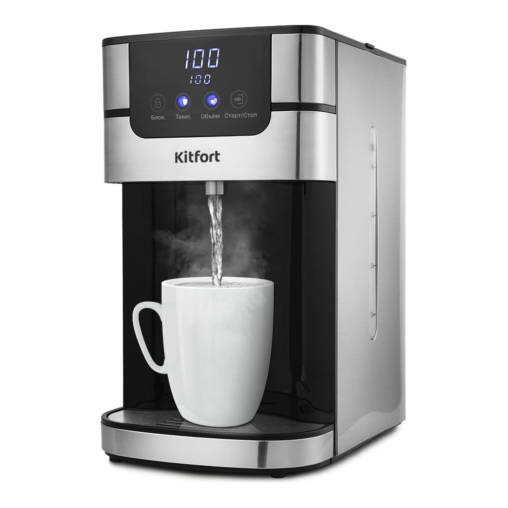 Термопот KITFORT мощность 2200-2618 вт емкость 4 л КТ-2501 служит для моментальной подачи воды заданной температуры без предварительного подогрева и ожидания. Подогрев осуществляется проточно, подача воды начинается в течение примерно 5 секунд после нажатия кнопки.Термопот не нагревает лишний объём воды, в результате чего экономится электроэнергия. Экономия по сравнению с обычными чайниками до 50%.При помощи сенсорной панели можно выбрать нужную температуру, объём порции (100-300 мл или неограниченно), а также включить функцию блокировки, что предотвратит нежелательное включение. Особенно важно, если в доме есть дети.Индикатор уровня воды на задней части прибора даёт возможность пользователю постоянно контролировать её объём.