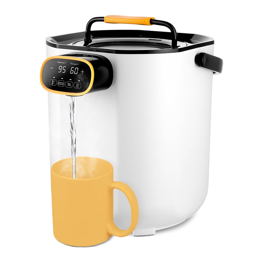 Термопот КТ-2520 служит для кипячения и нагрева воды до заданной температуры, а также поддержания температуры воды. Из прибора удобно наливать воду благодаря автоматической подаче воды. Дисплей показывает заданную и текущую температуру. Термопот оснащен функцией выбора температуры и может не только вскипятить воду, но и нагреть ее до температуры от 40 до 95 °С с шагом 1 °С. Режим «Дехлорирование». Кнопка «Дехлорирование» включает длительное кипячение воды для уменьшения содержания растворенного в воде хлора. В этом режиме вода нагревается до 100 °С и будет кипеть 5 минут. Тепло надолго! Двойные стенки термопота помогают сохранить тепло и реже включать нагрев, что поможет сэкономить на электроэнергии. Корпус термопота состоит из пластика, а резервуар для воды — из нержавеющей стали. Ёмкость резервуара 5 литров. Часть крышки прозрачная, это позволяет следить за уровнем воды в резервуаре. Термопот КТ-2881 оснащен удобной ручкой для переноски. Для безопасного и экономного использования! Нажмите на кнопку «ЕСО». Когда в помещении, где находится термопот, станет темно, прибор автоматически выключится. Термопот включится автоматически, когда в комнате станет светло. Блокировка кнопки подачи воды не позволит случайно включить подачу. Простой уход за прибором. Храните термопот в сухом и прохладном месте, недоступном для детей. Не используйте для мытья абразивные моющие средства. Не погружайте устройство в воду или под струю воды.