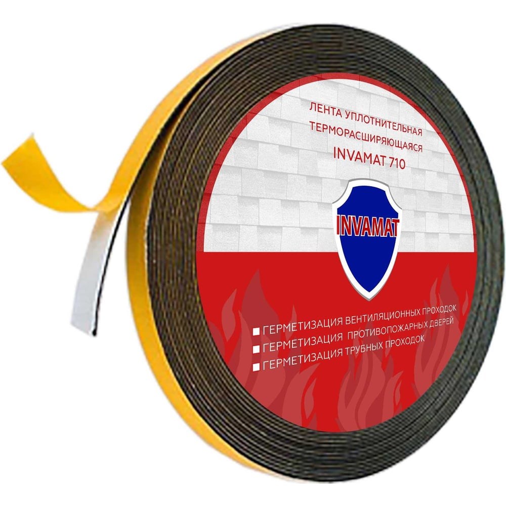 Лента уплотнительная терморасширяющаяся INVAMAT 710 с нанесенным клеевым слоем представляет собой гибкую ленту, которая предназначена для герметизации соединений ограждающих противопожарных конструкций, таких как: — Противопожарные двери (устанавливается по внутреннему периметру дверной коробки, либо по внешнему периметру дверного полотна); — Трубные проходки (устанавливается по внешней окружности трубы); — Герметизация вентиляционных проходок сквозь ограждающие конструкции и плиты перекрытия. Под воздействием открытого огня и высоких температур, лента INVAMAT 710 увеличивается в объеме, заполняя собой свободное пространство в узле примыкания, блокируя таким образом проникновение огня и дыма. Преимущества уплотнительной ленты INVAMAT 710 перед аналогичными продуктами заключаются в следующем: — Универсальность и удобство применения для монтажа узла заделки трубной проходки достаточно отрезать ленту нужной длины и наклеить на трубу, после чего поместить в проходку. Смонтированный таким образом узел трубной проходки не выступает за пределы перекрытия и ограждающей конструкции, выглядит более эстетично, что позволяет более качественно проводить отделочные работы и избежать применения противопожарных муфт. После монтажа допускается окраска ленты, или нанесение другого декоративного покрытия.