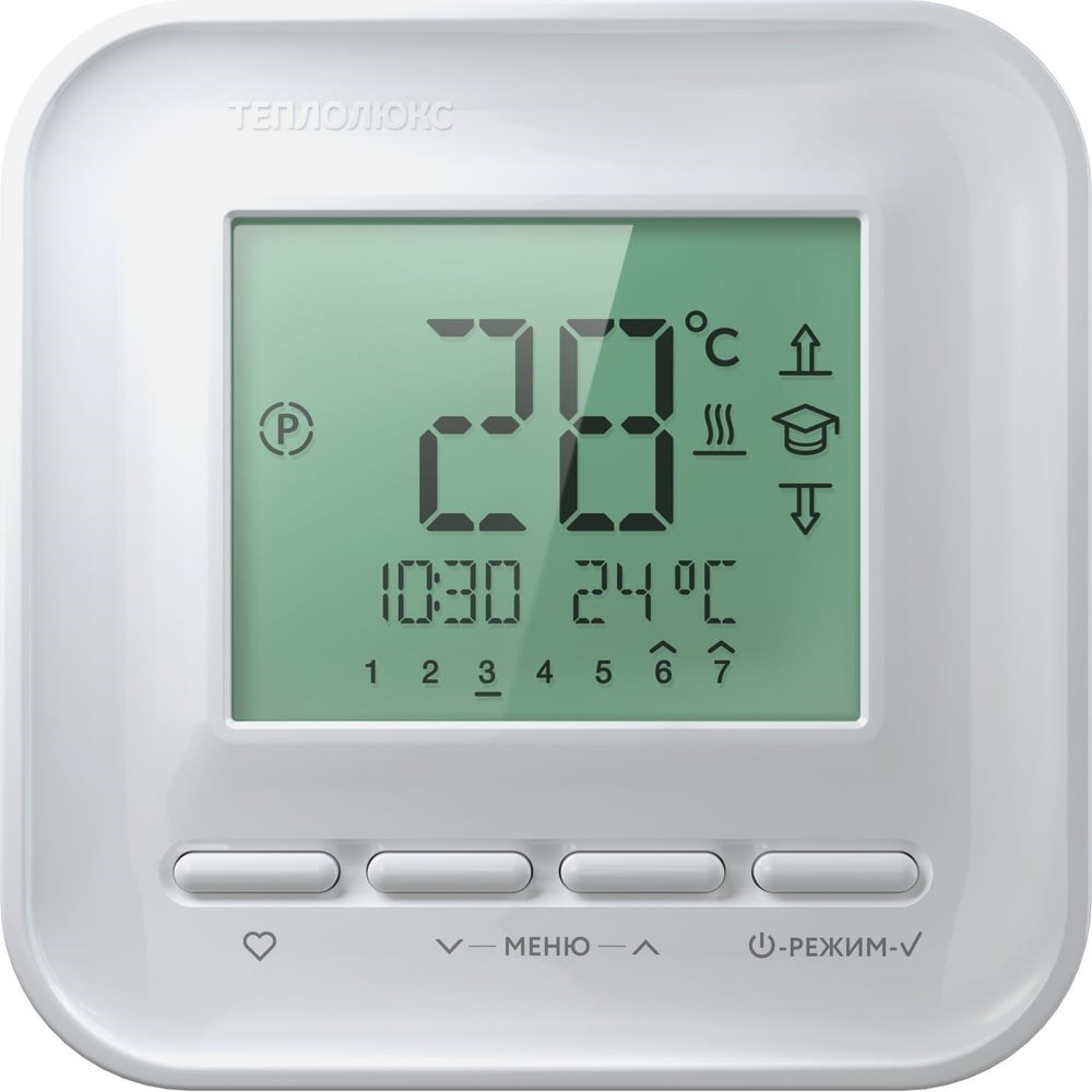 Интеллектуальный комфортТерморегулятор ТЕПЛОЛЮКС520 предназначен для управления теплыми полами с целью поддержания комфортной температуры в то время, когда в этом есть необходимость. Функция программирования позволяет ТЕПЛОЛЮКС 520, основываясь на характеристиках помещения, заранее включать обогрев с таким расчетом, чтобы достигнуть комфортной температуры точно в заданное пользователем время. Терморегулятор ТЕПЛОЛЮКС520 снабжен графическим дисплеем. Контрастные и хорошо читаемые цифры и пиктограммы интуитивно понятны для пользователя.Основная идея программного обеспечения терморегулятора ТЕПЛОЛЮКС 520 – экономия электроэнергии и удобный интерфейс управления. Для воплощения этой идеи в приборе запрограммированы четыре события – «утренний подъем», «рабочий день», «возвращение вечером» и «время сна». Пользователь имеет возможность задать для каждого из событий уровень поддерживаемой температуры теплого пола (комфортный подогрев и экономия), а также временной интервал переключения между ними.Терморегулятор запоминает данные установки для каждого дня недели отдельно и включает подогрев в нужное время.Дополнительно в модели ТЕПЛОЛЮКС 520 реализованы режим постоянного поддержания заданной температуры и режим «антизамерзания». В случае длительного отсутствия людей дома использование режима "антизамерзания" позволит обеспечить в помещении минимальную положительную температуру.Цвет белыйГарантия 3 года