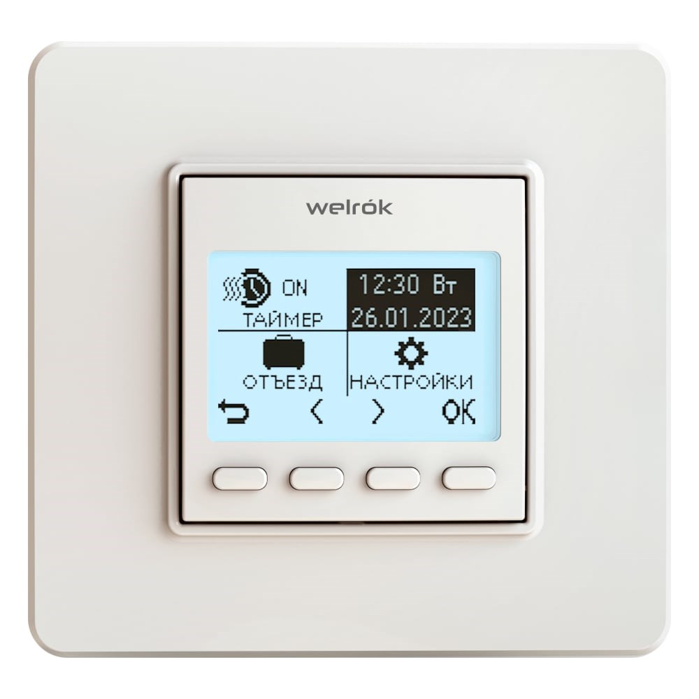 Welrok pro - терморегулятор для теплого пола с возможностью программирования недельного графика обогрева. Вы можете установить до 16 интервалов для каждого дня недели. В праздничные дни при желании можно установить индивидуальное расписание. Список праздничных дней можно выбрать из готового шаблона или создать индивидуальный. Термостат Welrok pro имеет 3 режима обогрева: «Воздух», «Пол» и «Воздух с ограничением по полу». Для чувствительных к перегреву паркетных или ламинатных полов подходит обогрев воздуха с ограничением по полу. Так комфортная температура воздуха будет поддерживаться не допуская перегрева пола. Термостат Welrok pro может работать в двух режимах - “Охлаждение” и “Обогрев”. Терморегулятор предназначен для электрических и водяных теплых полов, обогревателей. Управление водяными теплыми полами осуществляется с помощью нормально закрытого и не нормально открытого электротермического сервопривода с рабочим напряжением 230 В. Welrok pro имеет 2 датчика температуры: встроенный датчик температуры воздуха и внешний датчик температуры пола. Терморегулятор также совместим с датчиками температуры пола других производителей: 4.7, 6.8, 10, 12, 15, 33, 47 кОм при 25 °C.