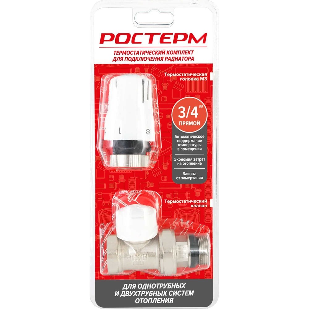 Клапан термостатический угловой РОСТерм 1/2" с термоголовкой для радиатора используются для автоматического поддержания заданной температуры помещения посредством управления потоком теплоносителя в приборе отопления. Необходимая температура подбирается вручную, а после этого термостат самостоятельно регулирует подачу воды для сохранения заданных параметров.Термостатическая головка РОСТерм М3 — автоматически поддерживает заданную температуру в помещении, регулируя поток теплоносителя в радиаторе;Термостатический клапан М30*1,5 — устанавливается на подающей трубе перед радиатором и служит для регулирования расхода теплоносителя.Преимущества: - Автоматическое регулирование температуры. - Повышение эффективности системы отопления: предотвращает перегрев или переохлаждение помещения. - Качественные материалы обеспечивают долгий срок службы. - Может использоваться в однотрубных и двухтрубных системах водяного отопления. Выгода: - Эффективное использование энергии, снижение расходов. - Функция защита системы от замерзания. - Установка температуры в диапазоне от 6,5 до 28 °C с точностью до 2 °C.Важно! При установке термоголовки необходимо установить положение термоголовки на 5 и только потом устанавливать на термостатический клапан, в противном случае термоголовка может работать некорректно (фиксируется резьбой, но шток термоголовки не плотно прижат к штоку клапана). После установки можно установить значение термоголовки согласно таблице температур.