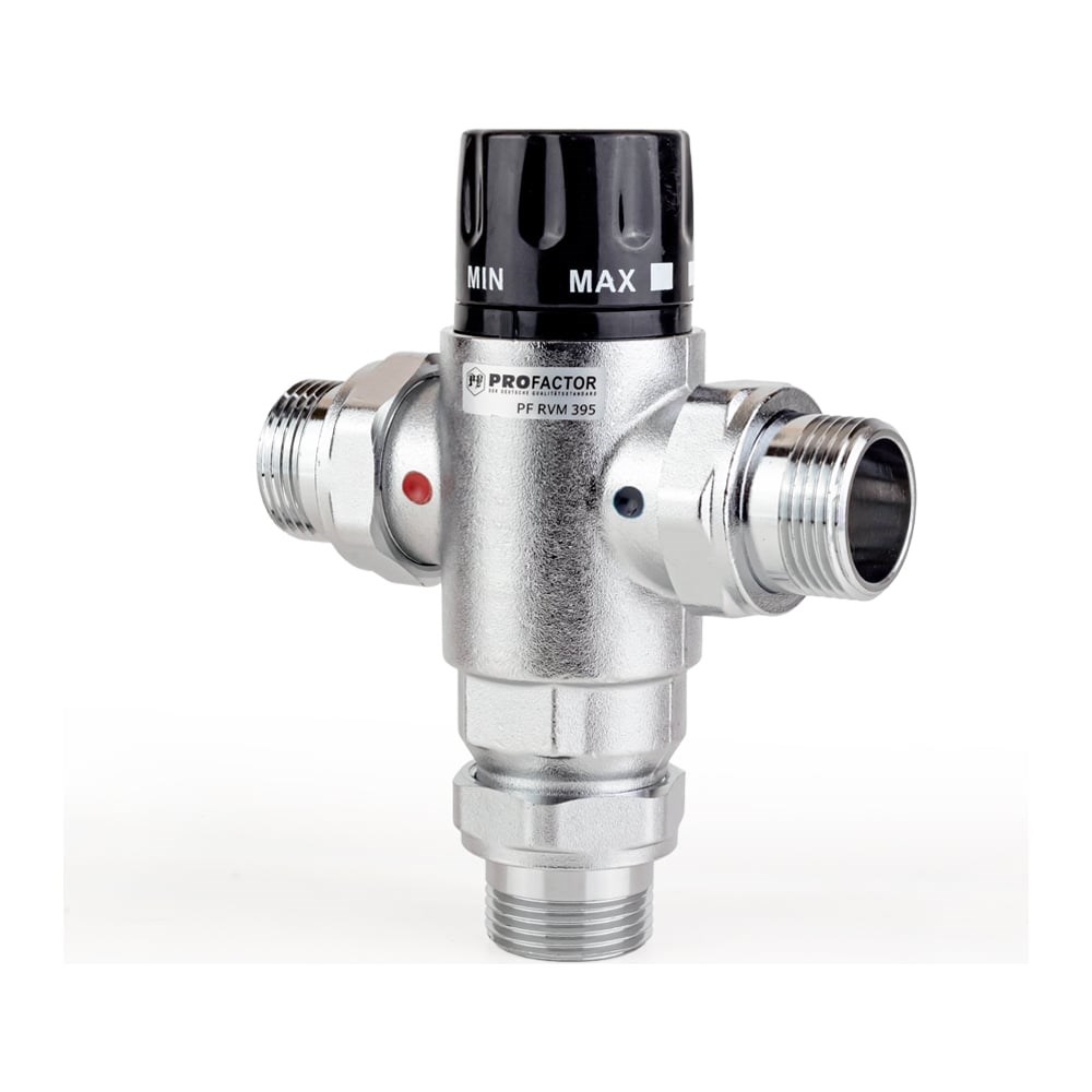 Термостатический смесительный клапан PROFACTOR 38_60С 1" PF RVM 395.25 предназначен для автоматического поддержания заданной температуры воды в системах горячего водоснабжения. Он позволяет моментально смешивать входящие жидкости (горячую и холодную воду) и обеспечивает стабильную температуру смешанной воды на выходе, независимо от изменения давления и температуры жидкостей на входе смесителя, не является запорным.