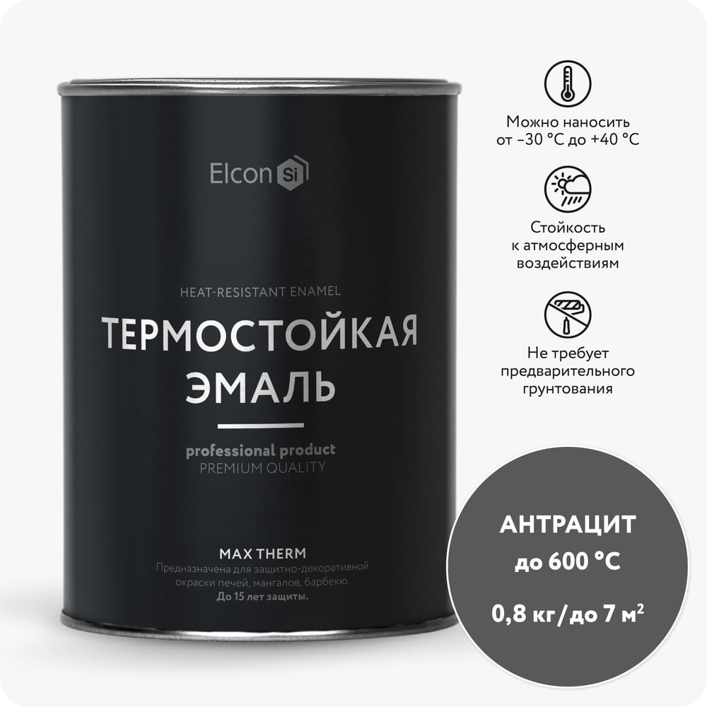 Термостойкая краска для металла, печей, мангалов, радиаторов, дымоходов, суппортов Elcon Max Therm антрацитовая, до 600 градусов, 0.8 кг 00-00002887 предназначена для антикоррозионной защиты металлоконструкций, оборудования, печей для саун, дымовых труб, выхлопных систем автомобилей, деталей двигателей, емкостного оборудования, подвергающихся в процессе эксплуатации воздействию температур от -60 °С до +600 °С*, а также для окраски минеральных поверхностей, длительно эксплуатируемых в условиях умеренного климата. *Термостойкость покрытия зависит от цвета и может составлять от +400 °С до +1200 °С Важно! Для обеспечения требуемых свойств покрытия необходимо провести термозакалку: выдержать при температуре окружающего воздуха в течение не менее 30минут, затем нагреть до температуры >250°C со скоростью 3,5°C в минуту и поддерживать эту температуру не менее 3часов. При достижении температуры 250°С покрытие начнет слегка дымиться, что является нормальным и свидетельствует о том, что идет процесс термозакалки. Области применения: Печи Оборудование Мангалы Котлы Трубопроводы Металлоконструкции Суппорта Выхлопные системы Детали двигателя Радиаторы Трубы отопления