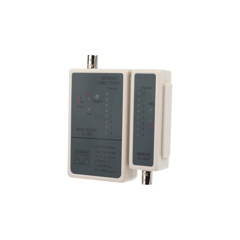 Тестер кабеля RJ-45 предназначен для тестирования коаксиальных кабелей и кабелей на основе витых пар. Тестер состоит из двух функциональных блоков — передатчика и приемника, которые подключаются к концам кабельной линии через разъемы RJ-45 или BNC.Инструмент проверяет правильность обжима, обрыв и короткое замыкание, а также целостность экрана для экранированной витой пары. Светодиодная индикация есть на основном блоке прибора и на удаленном модуле, на нее выводится результат тестирования. Корпус изготовлен из ударопрочной пластмассы и имеет красивый практичный дизайн.Батарея: 9В Крона (6F 22) (не поставляется в комплекте)