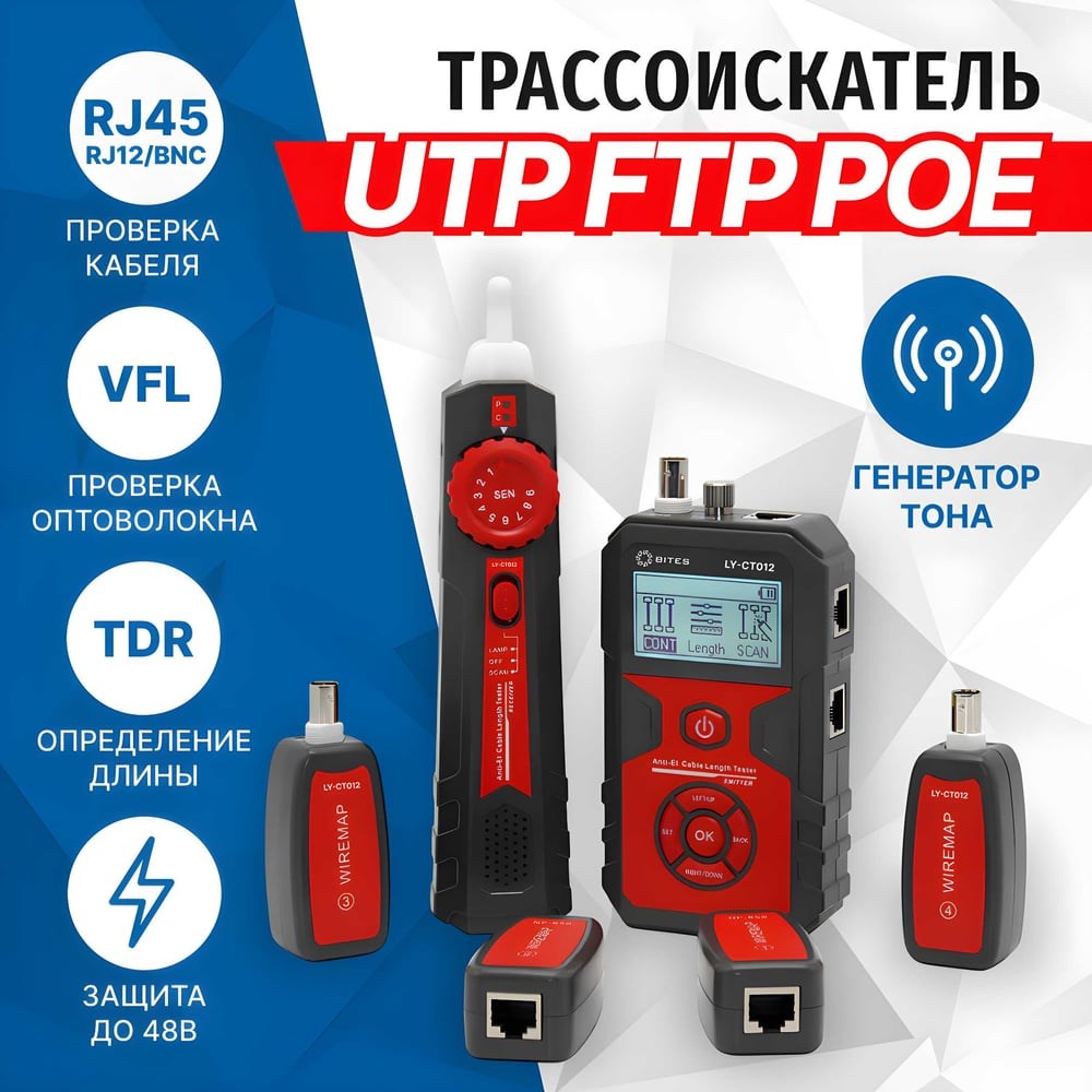 Многофункциональный POE тестер-трассоискатель 5BITES LY-CT012 – это кабельный тестер с функциями трассоискателя состоящий из передатчика, тонового генератора сигнала (щупа) и 4-х удаленных датчиков. Он позволяет не только трассировать кабели, измерять их длину и проверять разводку витых пар, но и визуализировать места повреждения оптоволоконных кабелей (функция VFL), а также определять состояние телефонных линий. Типы тестируемого кабеля: STP / UTP (CAT5, CAT5е, CAT6) / BNC / TEL / VFL Макс. дистанция трассировки: 2000 м ПЕРЕДАТЧИК (ОСНОВНОЙ БЛОК): Интерфейс: 3 порта RJ45, BNC, VFL, Micro USB Защита от напряжения: постоянное напряжение 48 В, ток 5 мА Частота генерируемого сигнала: 130 кГц Измерение длины сетевых кабелей: Да Трассировка кабелей: ДА Тестирование телефонной линии: Да Функция PORT FLASH: Да POE-тест коммутатора: Да VFL-тестирование оптоволоконного кабеля: Да Запись результатов тестирования: 6 групп результатов измерения длины и проверки кроссировки кабеля Настройка: настройка языка интерфейса, подсветки, времени авто-отключения, контрастности, сброс на заводские настройки, проверка версии программного обеспечения ЖК-экран: 58х40 мм (с подсветкой) Функционал ЖК-экрана: длина, карта проводников, сканирование, прозвонка, отсутствие адаптера, низкий уровень заряда батареи Размер: 135 x 78 x 35 мм ПРИЕМНИК (ЩУП) Интерфейс: RJ45, AUDIO, Micro USB Разъем для наушников: Да Светодиодная подстветка: Да Размер: 203 х 45 х 33 мм УДАЛЕННЫЕ ДАТЧИКИ Интерфейс: RJ45, BNC Количество: 4 шт