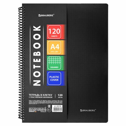 Тетрадь обложка пластик, А4, 120 л., спираль пластик, клетка, BRAUBERG "Metropolis", черный, 404740