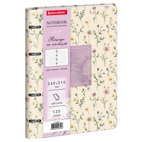 Тетрадь на кольцах БОЛЬШАЯ А4, 240х310 мм, 120 л., под кожу, BRAUBERG VISTA, "Пастельные цветы", 405204