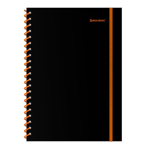 Тетрадь обложка пластик, А4 80 л., спираль пластик, резинка, клетка, BRAUBERG, черный/оранжевый, 405382