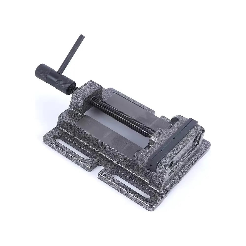 Тиски предназначены для использования на сверлильных станках. Низкая конструкция обеспечивает их устойчивое положение. Неподвижная губка имеет на своей поверхности вертикальные и горизонтальные V-образные проточки, что позволяет надежно и точно зажимать круглые заготовки помимо плоских. Конструкция тисков обеспечивает широкое расхождение губок, почти на весь размер тисков для зажима размерных заготовок. Отверстия на тисках для крепления проточены по длине, что позволяет легко позиционировать тиски при их установке.