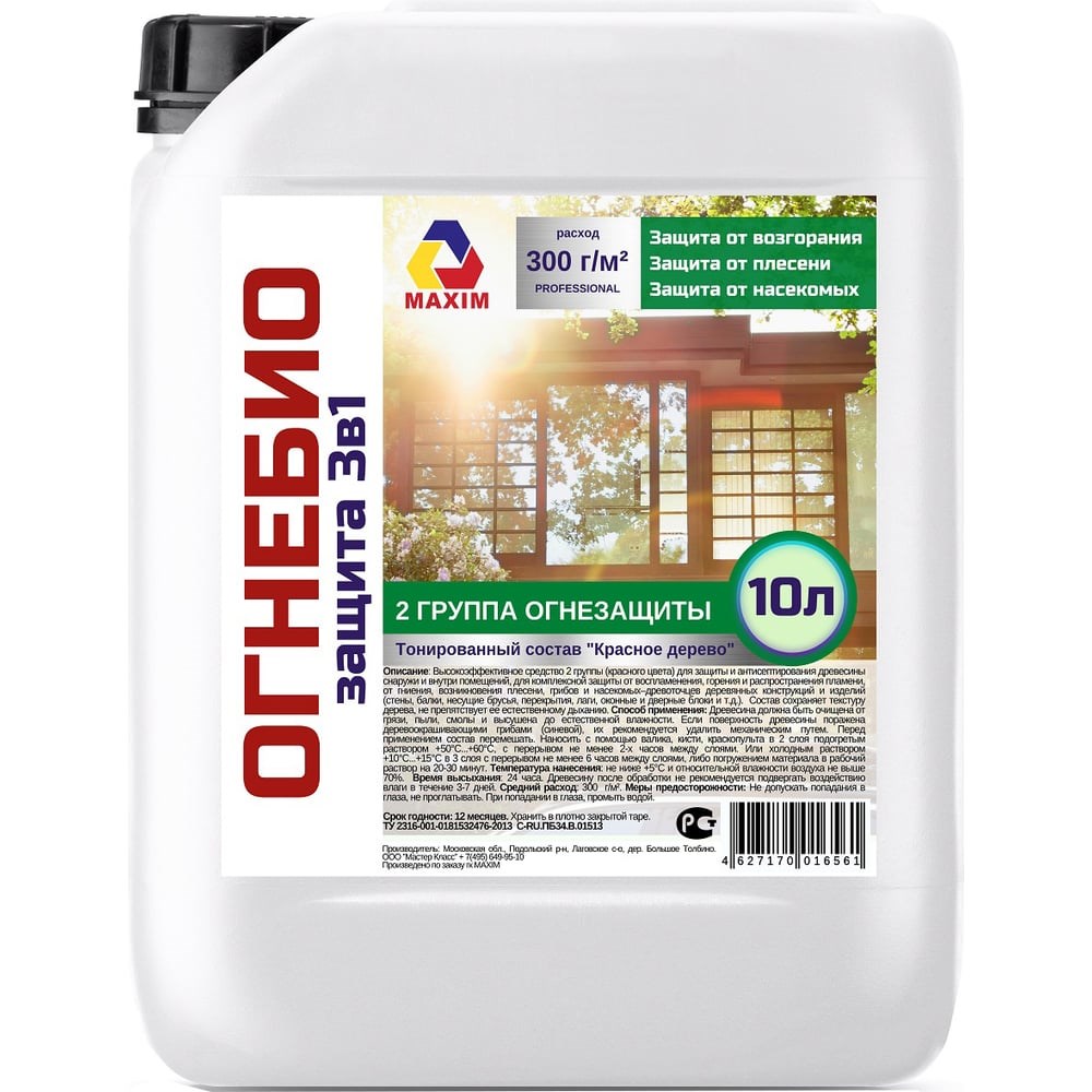 Огнебиозащита 2 группы тонированная Maxim 10 л 11606710 - это эффективное средство 2 группы (красного цвета) для защиты и антисептирования древесины снаружи и внутри помещений, для комплексной защиты от воспламенения, горения и распространения пламени, от гниения, возникновения плесени, грибов и насекомых–древоточцев деревянных конструкций и изделий (стены, балки, несущие брусья, перекрытия, лаги, оконные и дверные блоки и т.д.). Состав сохраняет текстуру дерева, не препятствует ее естественному дыханию.