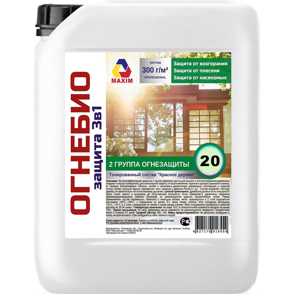 Огнебиозащита 2 группы тонированная Maxim 20 л 11606790 - это высокоэффективное средство 2 группы (красного цвета) для защиты и антисептирования древесины снаружи и внутри помещений, для комплексной защиты от воспламенения, горения и распространения пламени, от гниения, возникновения плесени, грибов и насекомых–древоточцев деревянных конструкций и изделий (стены, балки, несущие брусья, перекрытия, лаги, оконные и дверные блоки и т.д.). Состав сохраняет текстуру дерева, не препятствует ее естественному дыханию.