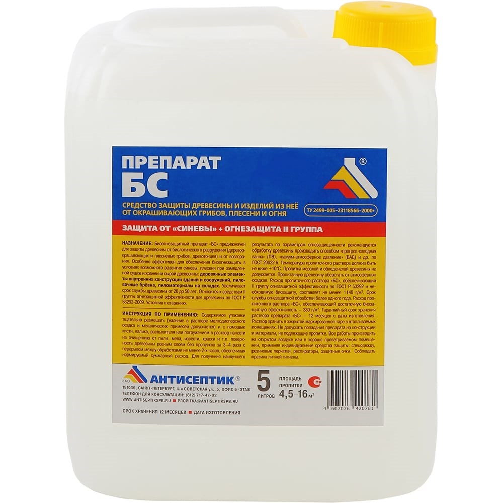 Транспортная огнебиозащита ЗАО "Антисептик" БС в канистре 5 литров 00-00003437 обеспечивает защиту древесины и изделий из нее от биологического разрушения (деревоокрашивающих и плесневых грибов, древоточцев) в условиях классов службы I-VII по ГОСТ 20022.2 и от возгорания. Особенно эффективен для обеспечения биоогнезащиты в условиях возможного развития синевы, плесени при замедленной сушке и хранении сырой древесины: деревянные элементы внутренних конструкций зданий и сооружений, пиловочные бревна, пиломатериалы на складах. Гарантийный срок службы огнезащитной обработки препаратом БС от одного года и более в зависимости от поглощения (удержания) препарата древесиной и условий ее эксплуатации. Защищенная биоогнезащитным препаратом «БС» древесина приобретает стойкость к воздействию биологических агентов ее разрушения (бактерий, грибов, насекомых) и воздействию огня. Пропитка деревянных конструкций препаратом «БС» увеличивает срок службы древесины от 20 до 50 лет в зависимости от поглощения (удержания) препарата древесиной и условий ее эксплуатации. Препарат «БС» относится к средствам II группы огнезащитной эффективности для древесины по ГОСТ Р 53292-2009. Устойчив к старению.