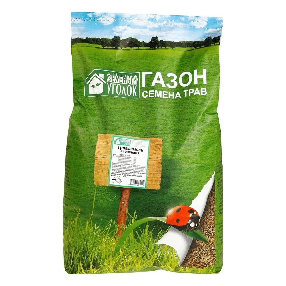 Семена газона Зеленый уголок травосмесь Теневая, 10 кг 4660001291195 применяются для озеленения приусадебных участков, парков, жилых зон. Благодаря своему составу травосмесь хорошо пригодна для затененных площадей. Высота скашивания 4-8 см.