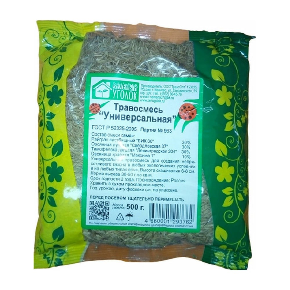 Семена газона Зеленый уголок Универсальная, 0.5 кг 4660001293762 - универсальная травосмесь для создания неприхотливого газона в любых экологических условиях и на любых типах почв. Высота скашивания 6-8 см.