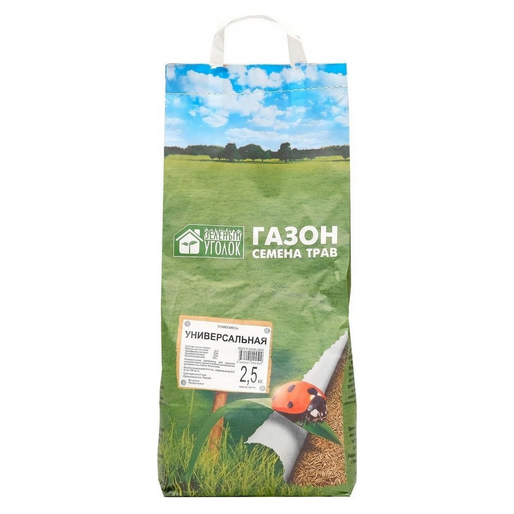 Семена газона Зеленый уголок Универсальная, 2.5 кг 4660001294509 - универсальная травосмесь для создания неприхотливого газона в любых экологических условиях и на любых типах почв. Высота скашивания 6-8 см.