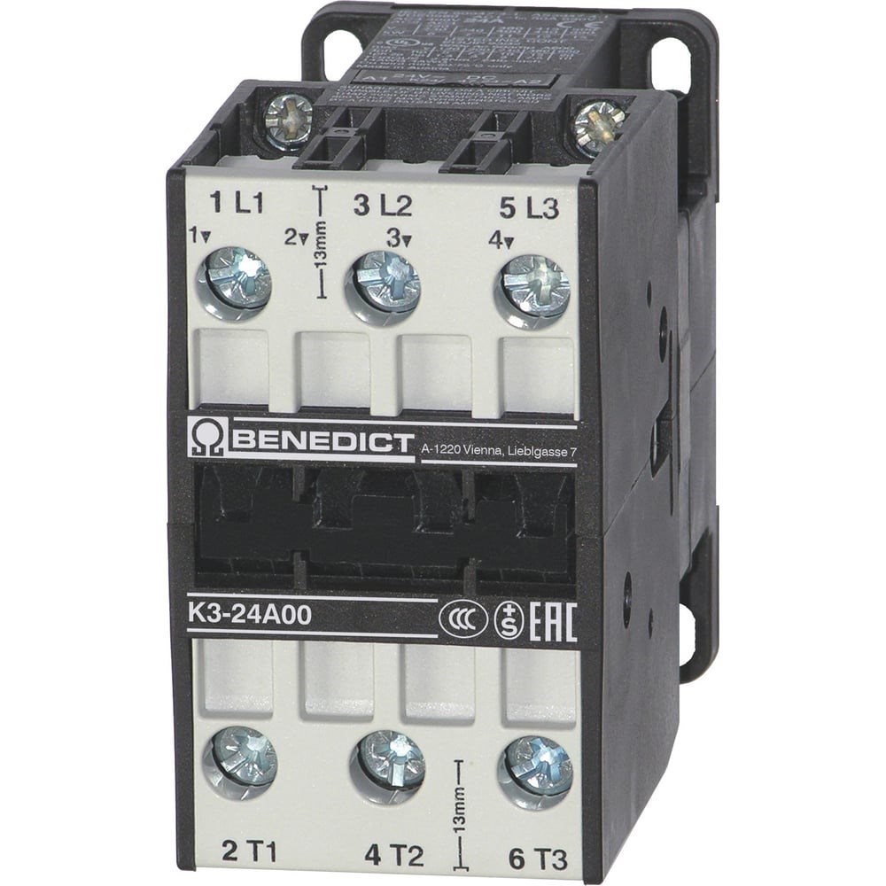 Трехполюсный контактор Benedict K3-24A00 230 (PN38315) предназначен, в первую очередь, для коммутации трехфазных асинхронных двигателей. Основные характеристики: Тепловой ток 50А Напряжение питания катушки управления 230V AC