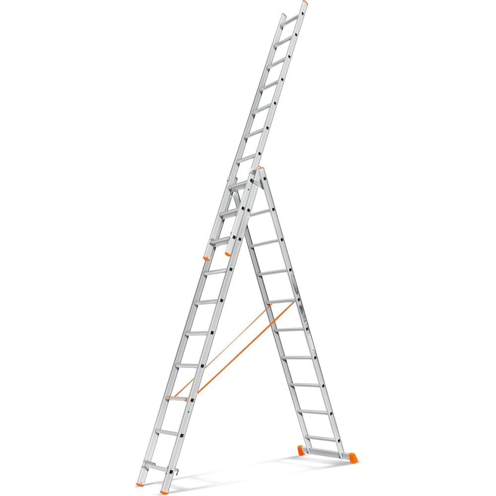 Трехсекционная лестница Эйфель Гранит 3х10 применяется при выполнении монтажно-отделочных работ. Отличается долговечностью, так как, во-первых, она изготовлена из алюминия, во-вторых, ступени завальцованы в направляющие. Капроновые страховочные ремни предотвращают раздвижение лестницы во время работы. На опорах имеются резиновые башмаки. Толщина профиля: узкая стенка - 1.6 мм, широкая стенка - 1.3 мм, ступень - 1.4 мм.