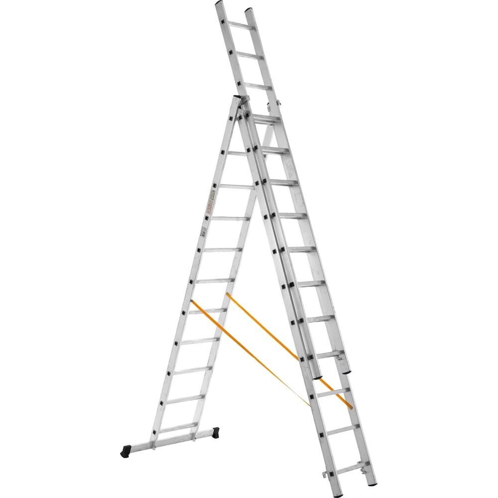 Трехсекционная лестница Inforce 3x11 ЛП-03-11 обладает способностью превращаться в различные модели конструкций. Используется на производствах. Прочность. Качественный профиль позволяет ей выдерживать нагрузку до 150 кг. Универсальность. Модель можно использовать в качестве стремянки, стремянки с выносной консолью, приставной лестницы с одной, двумя или тремя секциями. Отличная устойчивость. Широкая поперечная траверса и антискользящие пластиковые наконечники не дают лестнице смещаться.