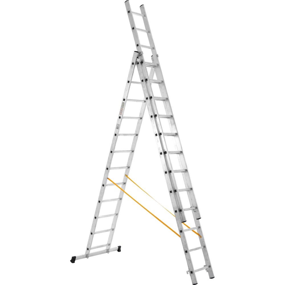 Трехсекционная лестница Inforce 3x12 ЛП-03-12 обладает способностью превращаться в различные модели конструкций. Используется на производствах. Прочность. Качественный профиль позволяет ей выдерживать нагрузку до 150 кг. Универсальность. Модель можно использовать в качестве стремянки, стремянки с выносной консолью, приставной лестницы с одной, двумя или тремя секциями. Отличная устойчивость. Широкая поперечная траверса и антискользящие пластиковые наконечники не дают лестнице смещаться.