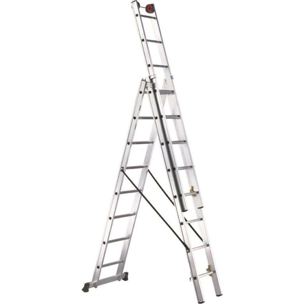 Трехсекционная лестница SVELT EURO E3 предназначена для профессионального использования. Трехсекционная алюминиевая лестница, трансформируемая как в приставную, так и в стремянку.может использоваться как стремянка с защитным приспособлением и как приставная лестница;профессиональные профили для интенсивного использования (57/64/84/100/115 мм);устойчивое положение обеспечивают большие опорные наконечники;максимально комфортное складывание и раскладывание обеспечивают эргономичные алюминиевые шарниры;обеспечена антискользящими плоскими ступенями (27 мм);ремни предотвращают внезапное складывание;предусмотрена деталь, предотвращающая опрокидывание третьего компонента;блокирующий рычаг не дает случайно складываться или выдвигаться секциям;трехсекционная лестница SVELT EURO E3 имеет стандартные стабилизаторы с нейлоновым усилением, а также английские ключи для установки стабилизатора;ограничитель выдвижения выше безопасного предела;оснащена роликами для перемещения;соответствует европейским стандартам UNI EN131;выдерживает максимальную нагрузку 150 кг;