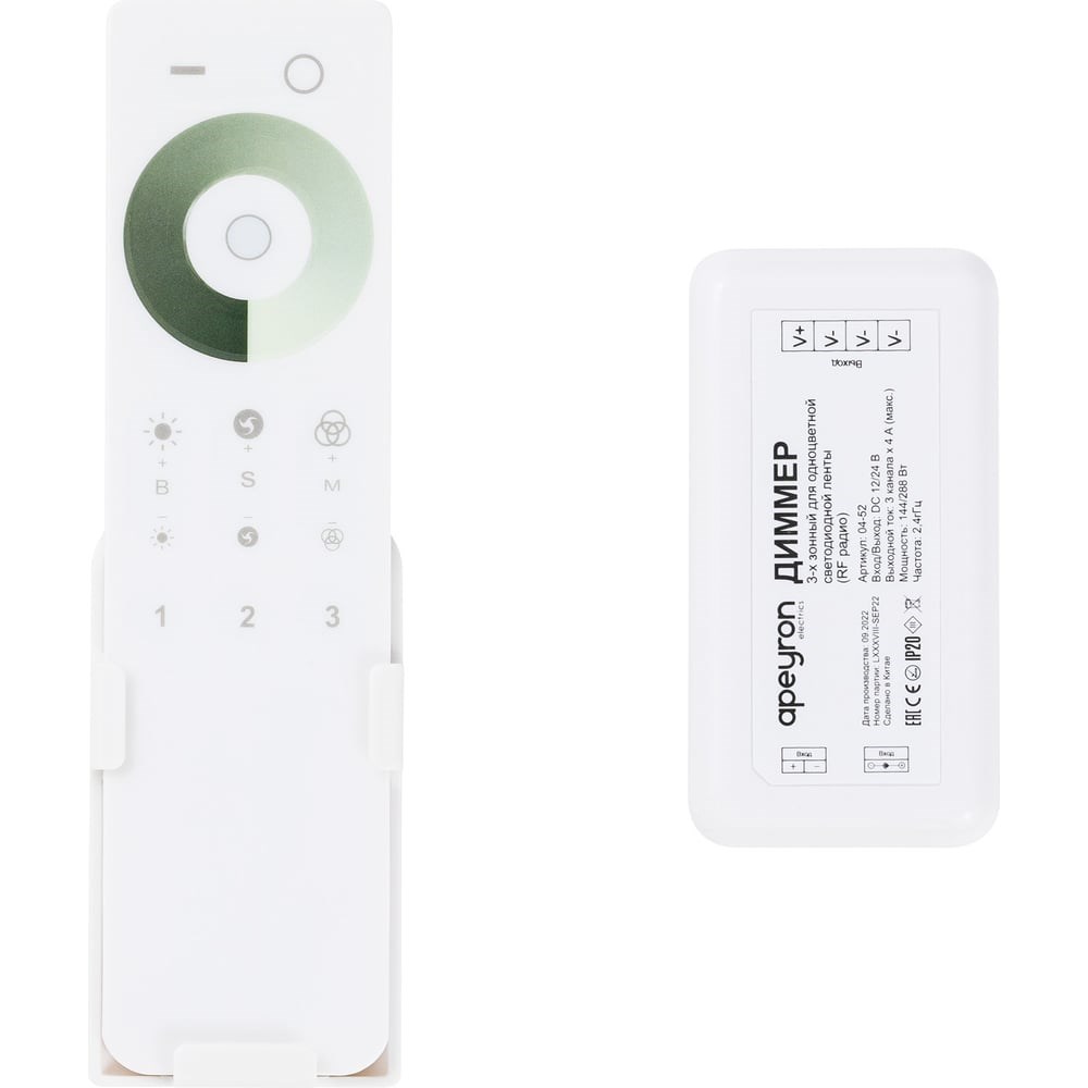 Трехзонный диммер предназначен для управления монохромной светодиодной лентой.К 1 пульту управления можно подключить до 3-х диммеров и управлять ими по отдельности, создавая нескольких зон освещения с уникальной световой и цветовой сценой для каждого помещения.С помощью диммера можно включать или выключать светодиодную ленту, отрегулировать ее яркость, а также использовать различные динамические режимы и отрегулировать скорость их работы.Одно из преимуществ данного изделия заключается в возможности работать как от напряжения 12 В, так и 24 В, а значит его можно использовать со светодиодными лентами с соответствующим напряжением. Важно отметить, что в зависимости от того, с каким напряжением предстоит работать устройству, будет отличаться и максимальная мощность нагрузки, которую можно подключить к нему. Так, при напряжении 12 В максимальная нагрузка будет равна 144 Вт, а при напряжении 24 В уже 288 Вт. Это значит, что к данному изделию вы можете подключить в два раза больше светодиодной ленты 24 В.Диммер укомплектован дистанционным пультом управления, передающим сигнал по радиоканалу, благодаря чему сам контроллер можно спрятать из зоны видимости, и он будет также качественно принимать сигнал от пульта и управлять светодиодной лентой. Управление происходит с помощью стильной сенсорной панели, расположенной на лицевой стороне пульта, который работает от 2-х батареек ААА (приобретаются отдельно).