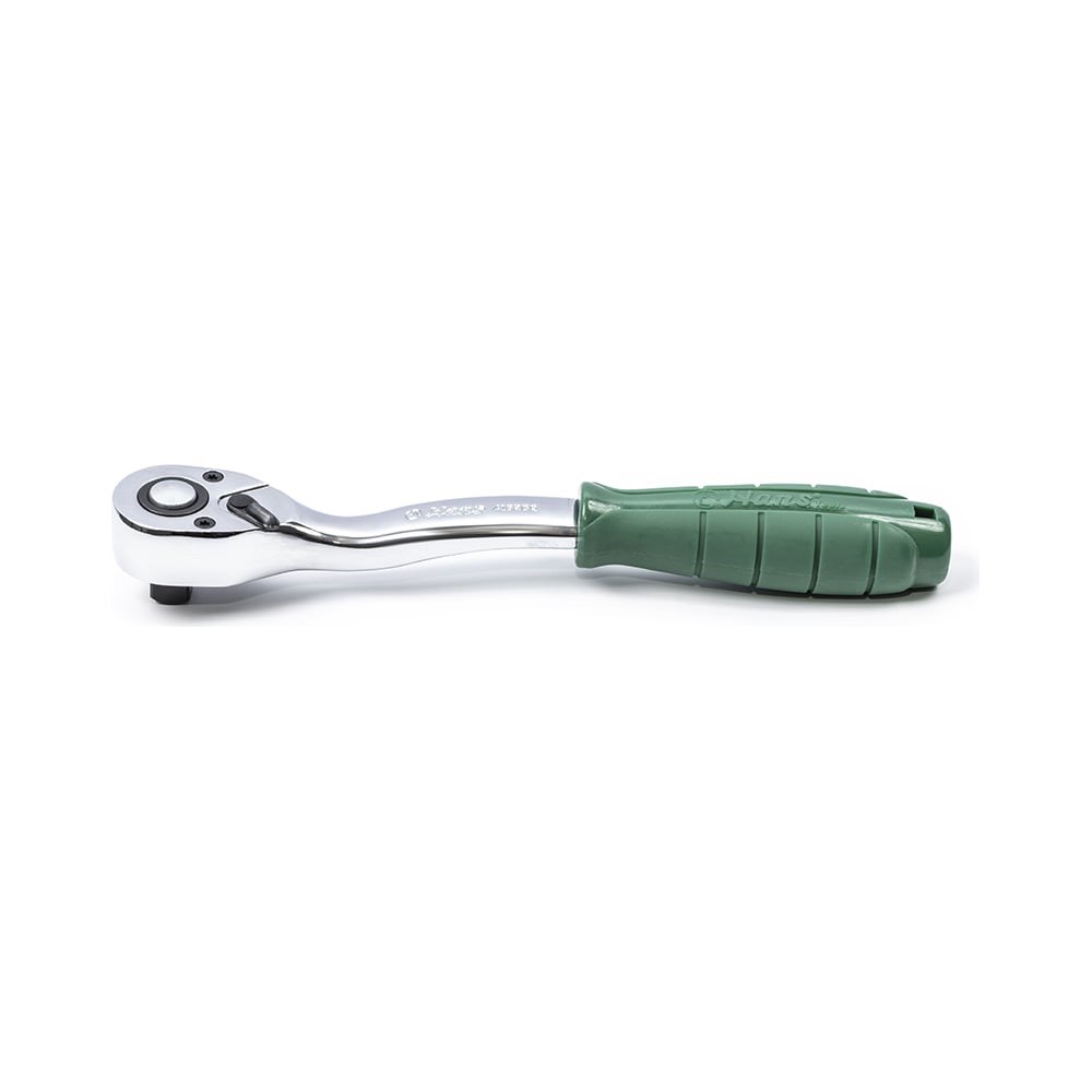 Трещотка с быстрым сбросом Hans 1/2" с изогнутой рукояткой 72 зуба 4162GQ это ключ, состоящий из 2 частей: откручивающая головка с храповым механизмом и рукоятка. Предназначен для использования с торцевыми головками, головками со вставками, битами (через адаптер).НазначениеТрещотка предназначена для откручивания/закручивания гаек и болтов при обслуживании автомобилей и другой техники в домашних и автослесарных мастерских, на производствах или СТО.ОсобенностиТрещотка с храповым механизмом и изогнутой ручкой отличается простотой и удобством в применении. Трещоточный механизм ключа позволит работать им, не отрывая от закручиваемой детали. Резиновая накладка на ручке не позволяет инструменту скользить. Имеет флажок реверса и кнопка быстрого сброса.КачествоТрещотка изготовлена из закаленной хром-ванадиевой стали, устойчивой к механическим нагрузкам. Технология изготовления включает в себя метод горячей ковки с последующей термообработкой, что придаёт особую прочность, высокую надёжность, - все те качества, соответствующие требованиям стандартов DIN 3122- ISO 3315. Хромированное покрытие защищает от коррозии.ГарантияНа трещоточные ключи бренда HANS распространяется комбинированная гарантия: на тело ключа - пожизненная, на храповый механизм - 12 месяцев.ВНИМАНИЕ!Не допускается срыв крепежа трещоточной частью ключа.