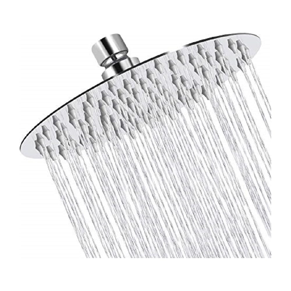 Верхний душ выполнен из нержавеющей стали, цвет полированный хром, диаметр лейки - 20 см, присоединительный размер - 1/2 дюйма, внутренняя резьба, кронштейн с шарниром для изменения угла наклона, прорезиненные форсунки облегчают чистку.
