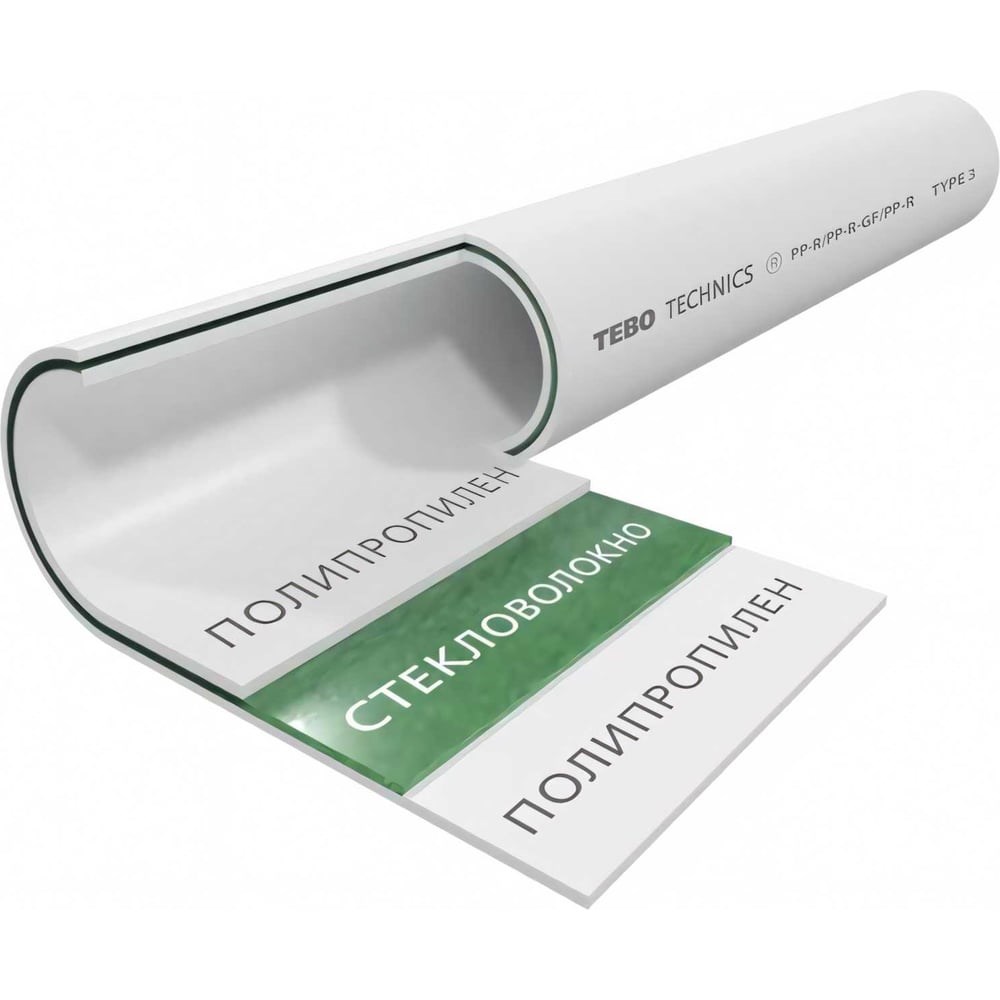 Полипропиленовые трубы TEBO technics (SDR6) применяются в системах хозяйственно-питьевого назначения, горячего водоснабжения, отопления, а также в качестве технологических трубопроводов, транспортирующих жидкости и газы, не агрессивные к материалам трубы и фитингов. Наружный и внутренний слой трубы TEBO technics изготовлены из современного материала — Polypropylene Random Copolymer («Рандом сополимер» PP-R тип 3). Между этими слоями находится слой полипропилена с содержанием стекловолоконной фибры (GF) 20%, окрашенный в зеленый цвет. Армированные стекловолокном трубы имеют более низкий коэффициент теплового расширения и высокую поперечную жесткость. Слой стекловолокна не защищает трубу от кислородной диффузии. Трубы и фитинги TEBO technics соответствуют нормам стандартов ГОСТ 32415-2013, DIN 8077/8078.